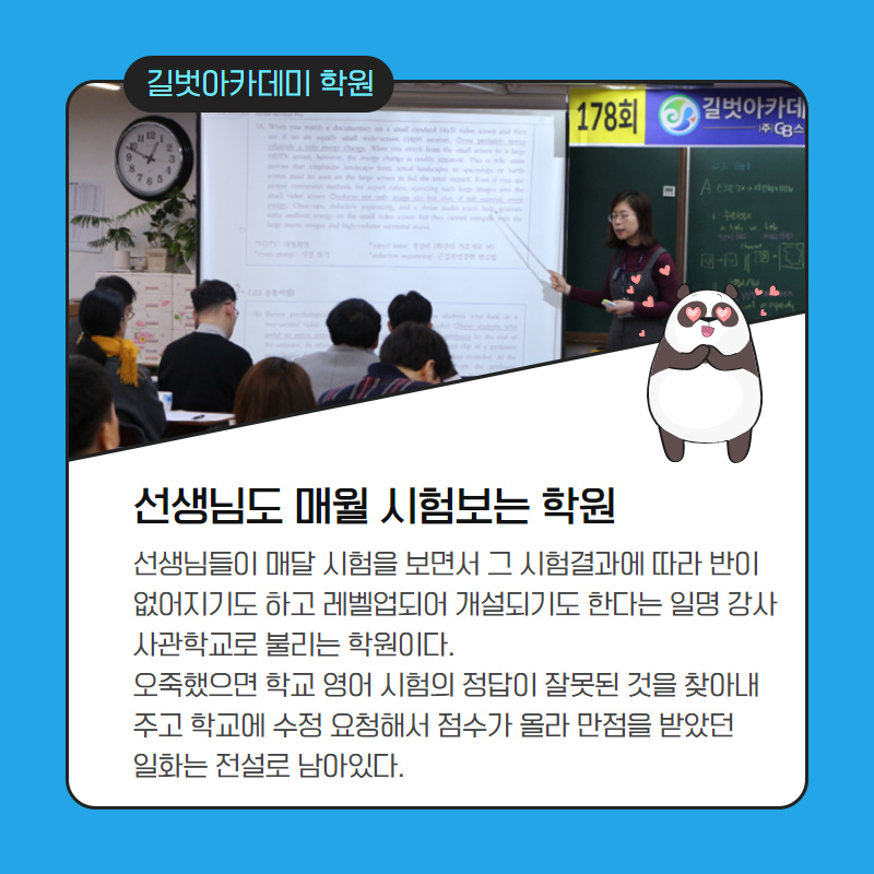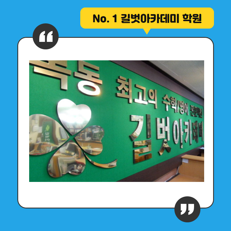 길벗 선생님들의 실력은 주관적인 생각이지만 목동에서 만큼은 1타 강사급이라 생각한다. 오죽했으면 학교 영어 시험의 정답이 잘못된 것을 찾아내주고 학교에 정정 요청해서 점수가 올라 만점을 받았던 일화는 개인적인 전설로 남아있다.