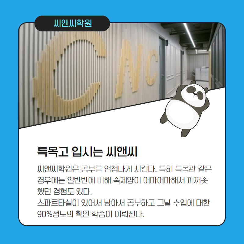 일단 씨앤씨학원은 공부를 엄청나게 시킨다. 특히 특목관 같은 경우에는 일반반에 비해 숙제양이 어마어마해서 피꺼솟 했던 경험도 있다.