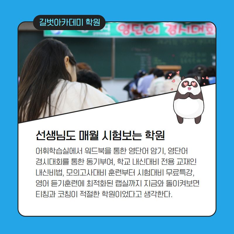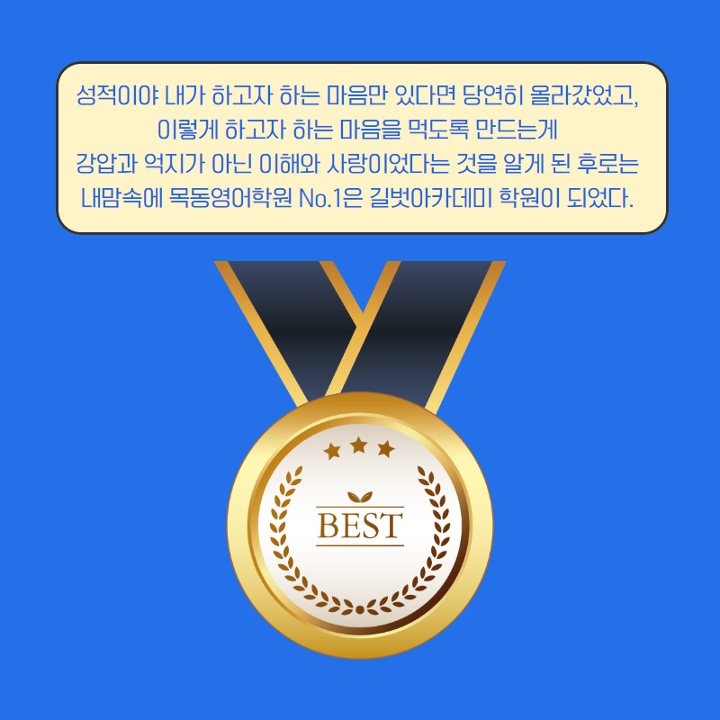 아무튼 성적이야 내가 하고자 하는 마음이 있다면 당연히 올라갔었고, 이렇게 하고자 하는 마음을 먹도록 만드는게 강압과 억지가 아닌 이해와 사랑이었다는 것을 알게 된 후로는 내맘속에 목동영어학원 No.1 은 길벗아카데미 학원이 되었다.
