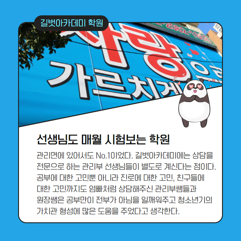 관리면에 있어서도 No.1이었다. 길벗아카데미에는 상담을 전문으로 하는 관리부 선생님들이 별도로 계신다는 점이다. 공부에 대한 고민뿐 아니라 진로에 대한 고민, 친구들에 대한 고민까지도 엄빠처럼 상담해주신 관리부쌤들과 원장쌤은 공부만이 전부가 아님을 일깨워주고 청소년기의 가치관 형성에 많은 도움을 주었다고 생각한다.