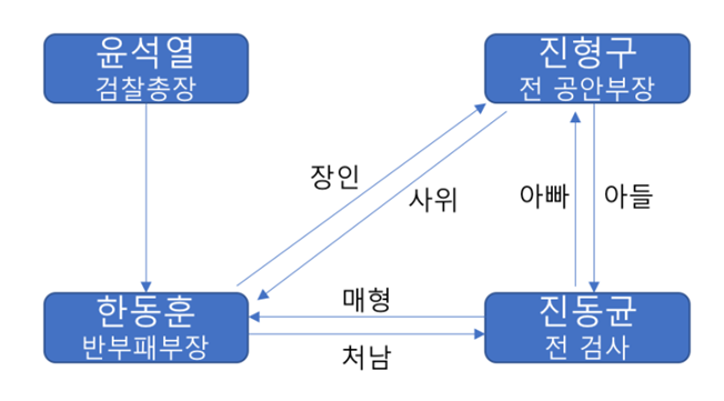 현재 거론되고 있는 인물들 한동훈 검사, 진동균 전 검사, 윤석열 총장, 진형구 전 공안부장과의 관계도라고 합니다.