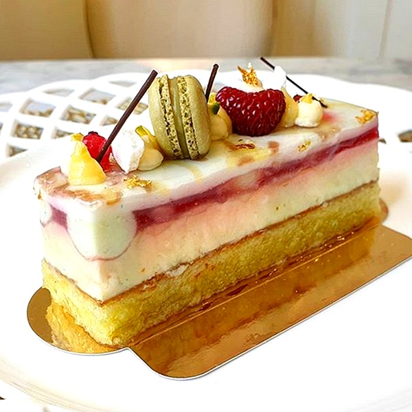 마스카포네 무스와 자몽 딸기 가나슈, 피스타치오 휘낭시에, 초콜릿 제누아즈, 밀크 사브레로 구성된 케이크