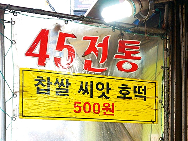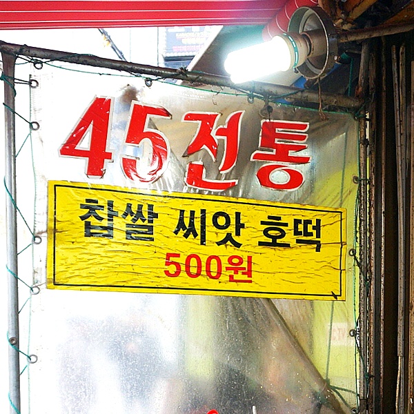 이 밖에도 큰 철판에 지글지글 구워진 45년 전통의 찹쌀씨앗호떡도 남포동 씨앗호떡 만큼이나 유명하다고 하네요. 가격은 단돈 500원