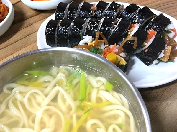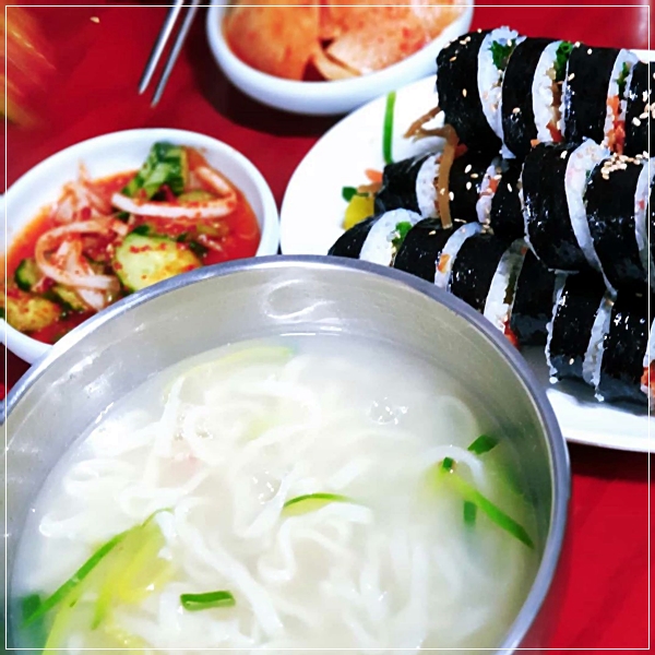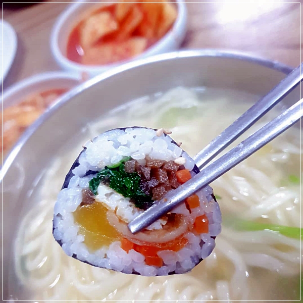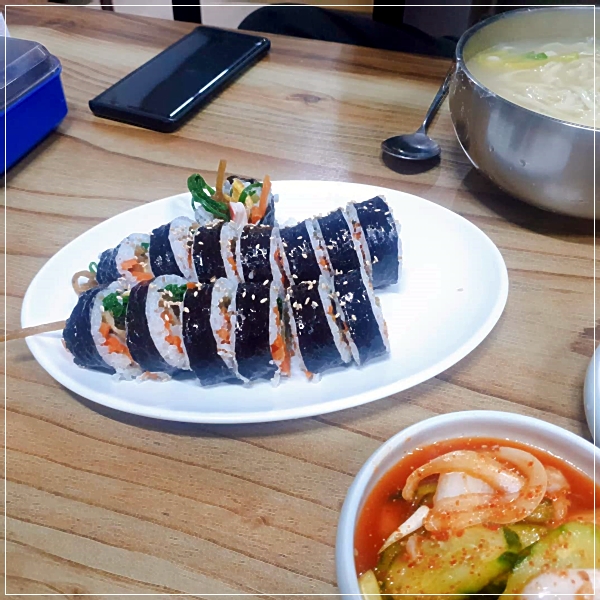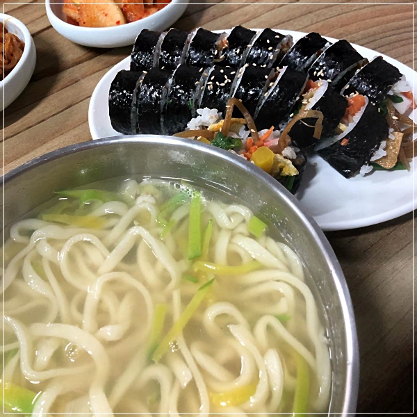 물국수 경남사천맛집 - 비오는 흐린날 꿀조합은 유정김밥의 우엉김밥에 물국수 쵝오!
