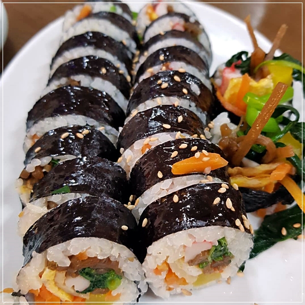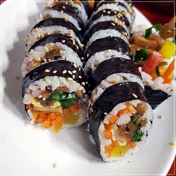 우엉을 비롯해 당근과 우엉, 시금치, 단무지, 달걀, 맛살 재료들이 푸짐하게 들어가 있는 속이 꽉찬 김밥은 한줄만 먹어도 출출한 배를 달래줄 정도라고 하는데요. 기본적으로 들어가 있는 햄을 빼고 우엉이 들어가 있는 덕에 약간은 호불호가 있는 김밥이기도 합니다.