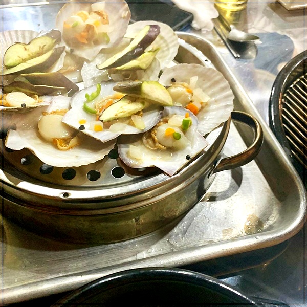 먼저 맨 꼭대기층엔 가리비와 함께 가지가 있고, 두번째 단에는 전복과 함께 새우 가지 키조개 등의 해물이 들어있다고 해요.