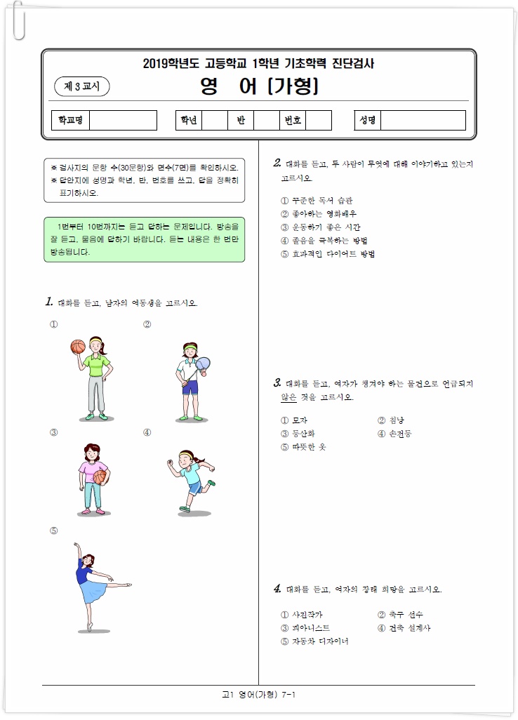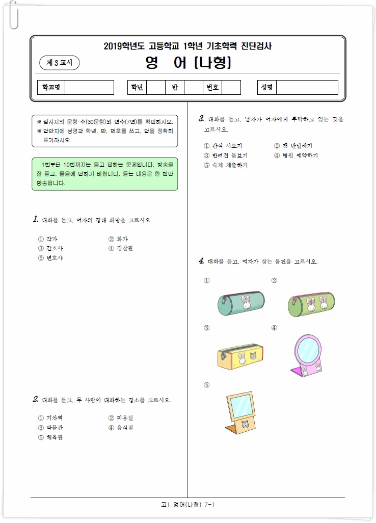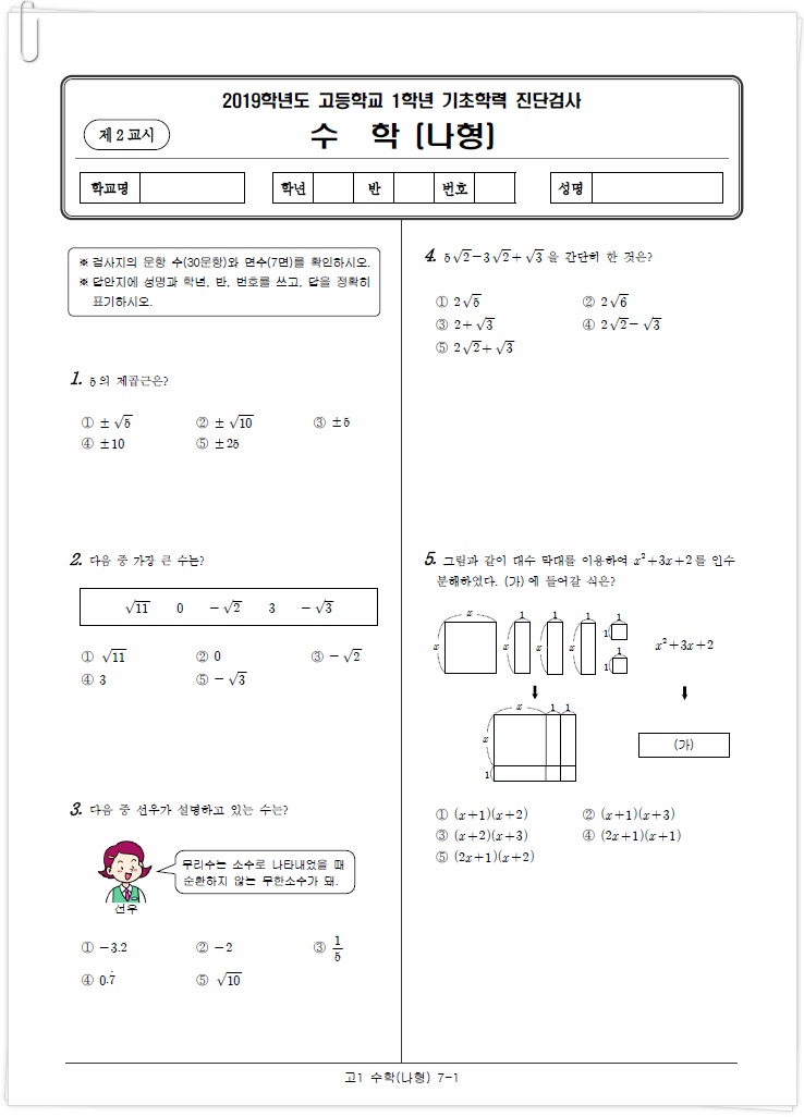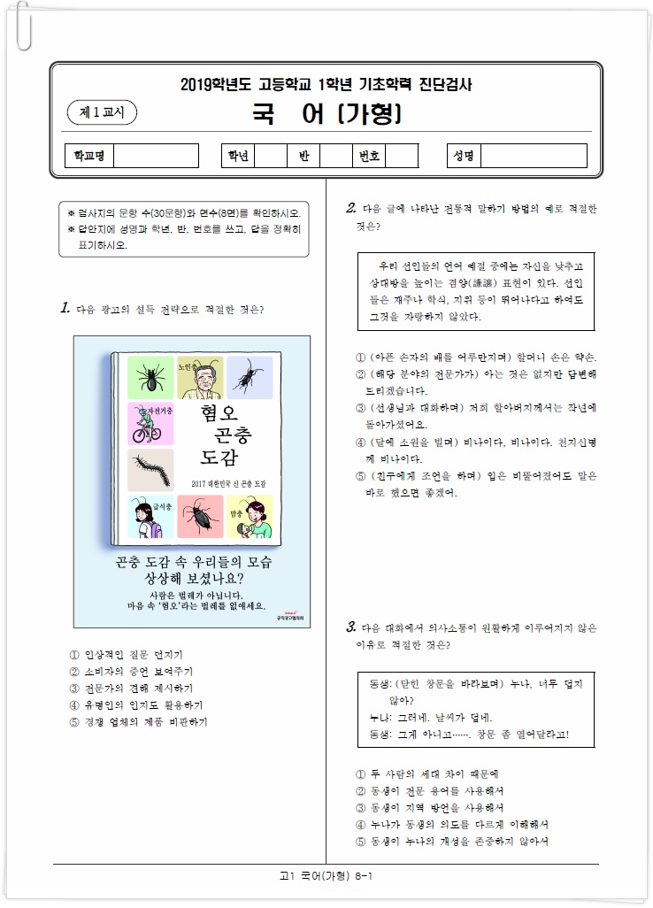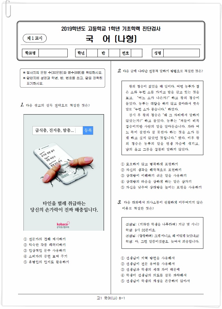 아래는 이번 2019년 3월에 시행된 각 과목별 국어, 수학, 영어 고1 진단평가 문제의 앞부분이에요.