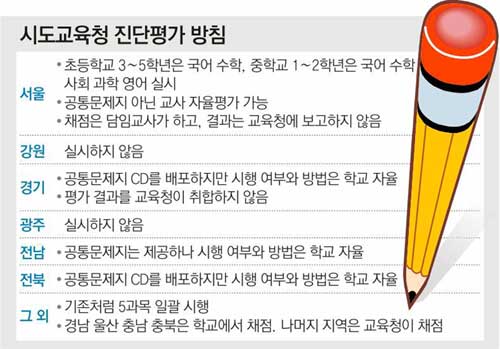진단평가 (기초학력 진단검사)는 전국 또는 도 단위로 같은 학년이 같은 시간에 같은 문제로 각 학교에서 치르는 일제고사 형태의 시험입니다.