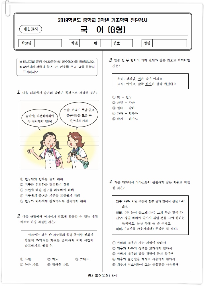 아래는 이번 2019년 3월에 시행된 각 과목별 국어, 수학, 영어, 과학, 사회 중3 진단평가 문제의 앞부분이에요.