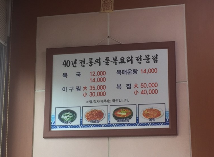 아래는 졸복국을 포함한 복매운탕, 복찜 등의 가격표입니다.