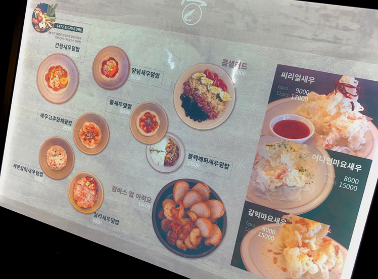 간장새우덮밥과 그외 새우요리 메뉴들의 메뉴판 사진입니다.