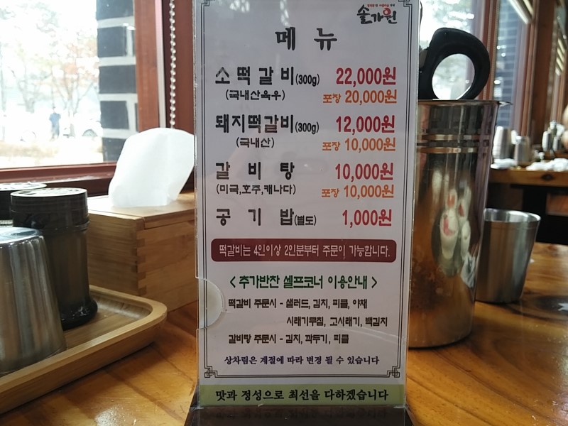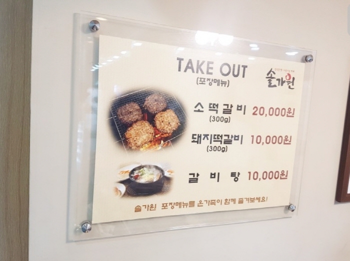 솔가원 메뉴를 보시면 아시겠지만 소떡갈비 말고도 돼지떡갈비, 갈비탕도 팔고 있습니다.