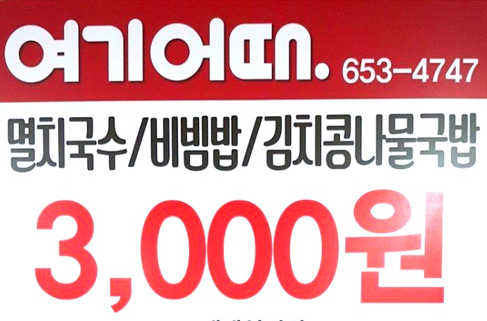 콩나물비빔밥도 3천원, 멸치국수도 3천원이네요. 특히 삼계탕 7,000원은 일반 국밥 가격인데 정말 놀라울 따름입니다.