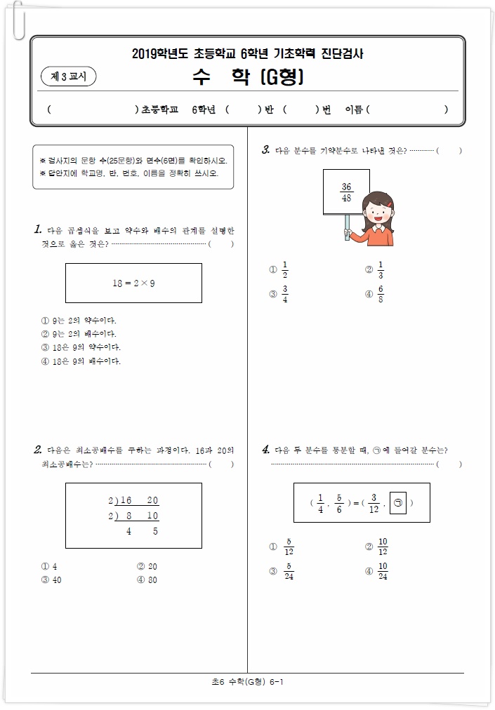 아무튼 초6 진단평가 기출문제들을 살펴보면 기 출제되었던 문제들이 반복되어 출제되는 경우도 많이 있다고 하니 그런 의미에서 작년, 제작년 기출문제들을 풀어보는 것도 시험대비에 많은 도움이 되겠죠?