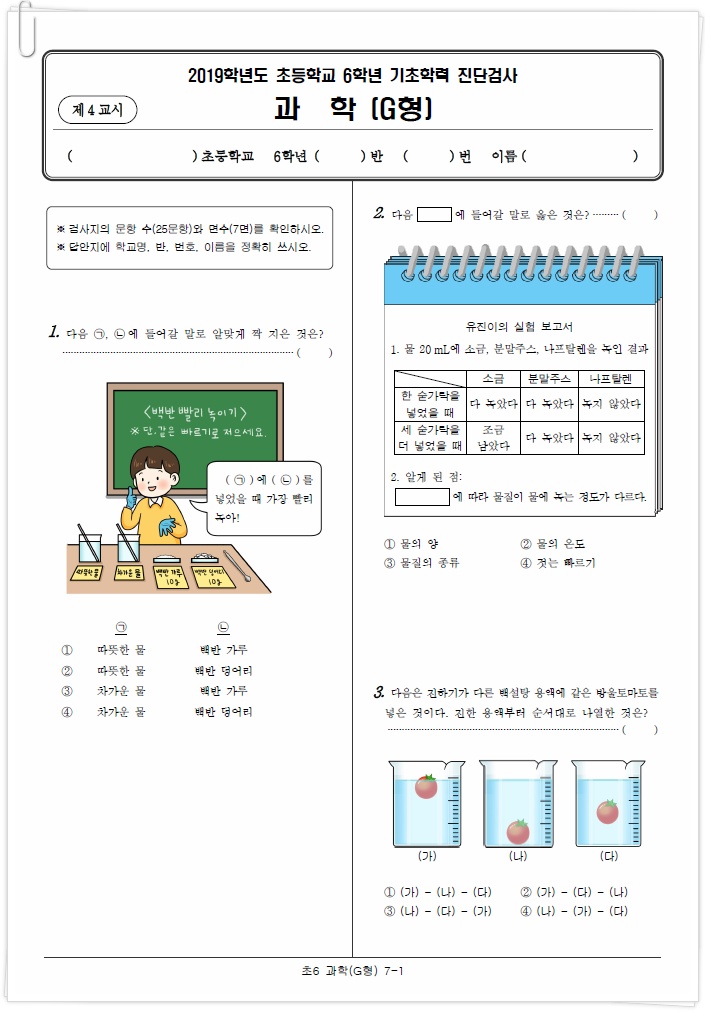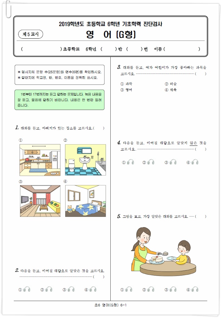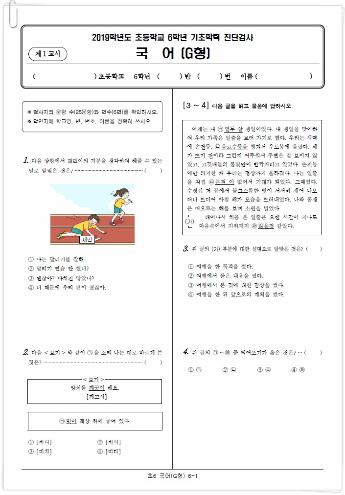 아래는 이번 2019년 3월에 시행된 각 과목별 국어, 수학, 영어, 과학, 사회 초6 진단평가 문제 자료입니다.