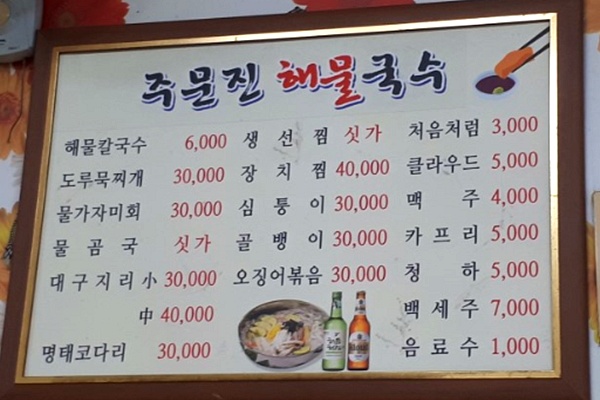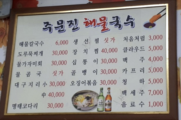 백반기행 강릉편 방송 예고 영상에 나온 식당의 메뉴판이 주문진해물국수 메뉴판의 메뉴 종류와 가격, 배치등이 상당히 유사함을 알 수 있습니다.