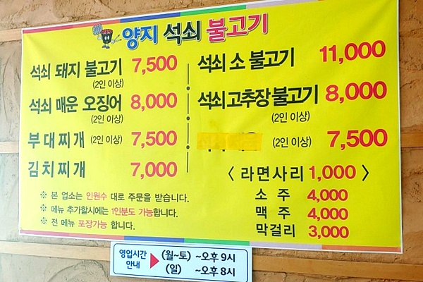 양지 석쇠불고기 백반 주소는 경기 용인시 처인구 양지면 남곡로 4, 남곡리 133-7 이며, 영업시간은 월~토 오후 9시까지, 일요일은 오후 8시까지입니다.