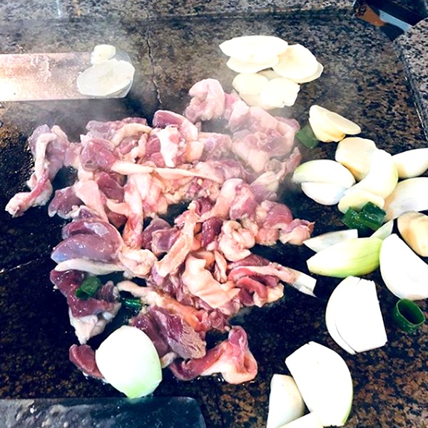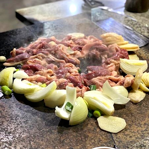 싱싱한 오리와 양파가 같이 돌판에서 익혀져 나오는데 와사비소스와 같이 쌈싸먹는 맛은 정말 일품이라고 하네요.
