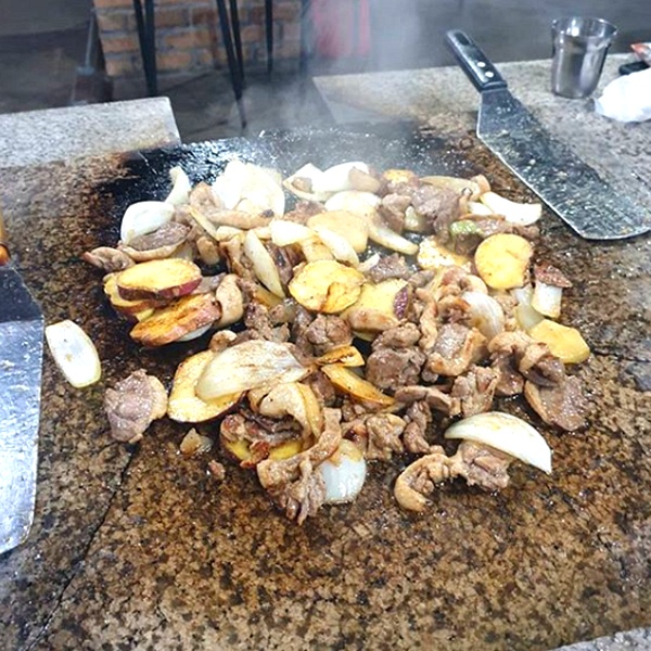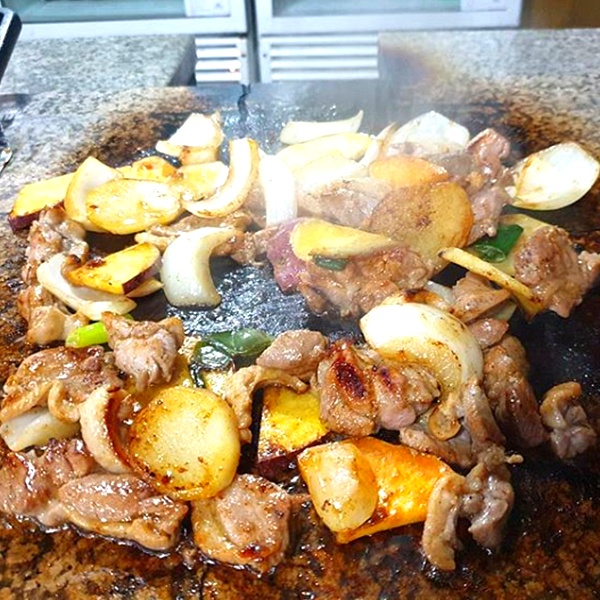 나중 치즈볶음밥이 일품이다 - 오리 로스와 양념구이를 돌판에다 구워준다.
