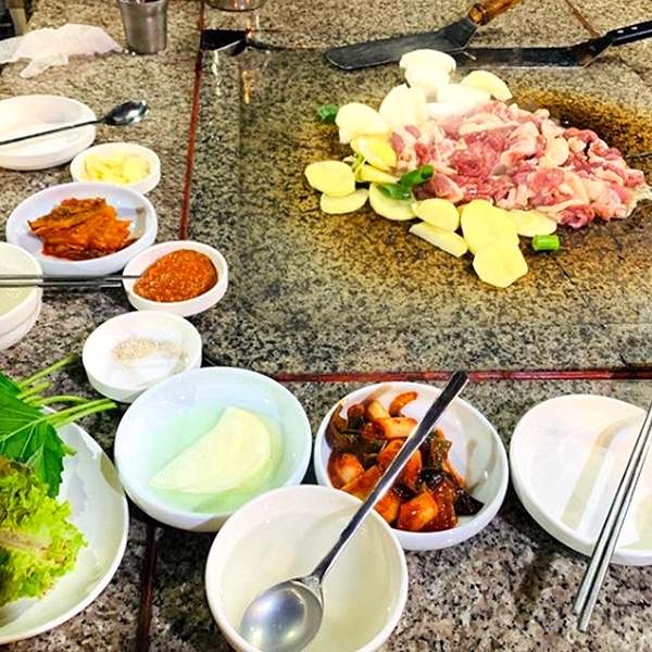뜨겁게 달궈진 돌판위에서 오리로스구리로 익혀 먹는데 이 돌판 옆에 상차림도 이뤄지면서 먼가 특별함을 더해줍니다.