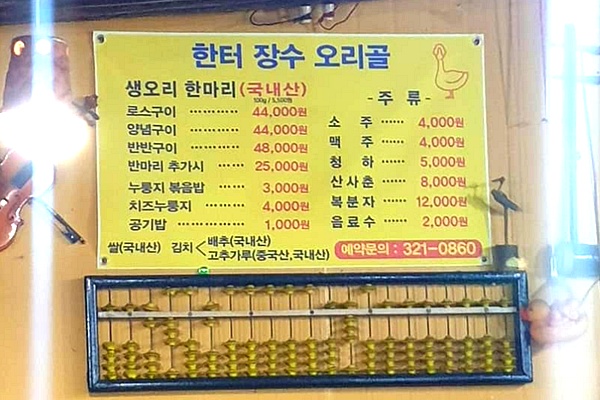 마지막으로 백반기행 용인 생오리돌판구이 누룽지볶음밥 맛집으로 추정되는 한터장수오리골의 메뉴와 가격, 그리고 위치장보 공유해드릴게요.