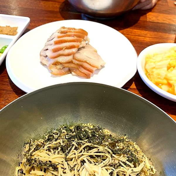 수육을 한 점 집어 새우젓에 살짝 담근 뒤 입으로 가져간다. 으흠 야들야들한 식감은 물론 느끼하지도 않고 촉촉하니 맛이 좋다. 곧 이 집의 시그니처 메뉴인 들기름 막국수가 나왔다.