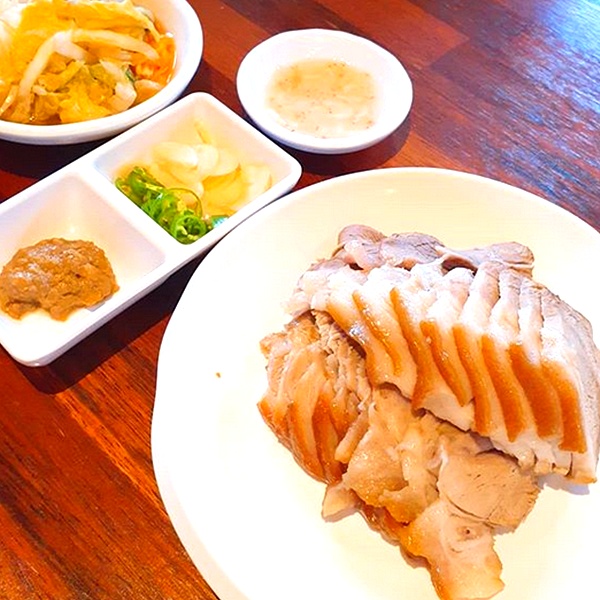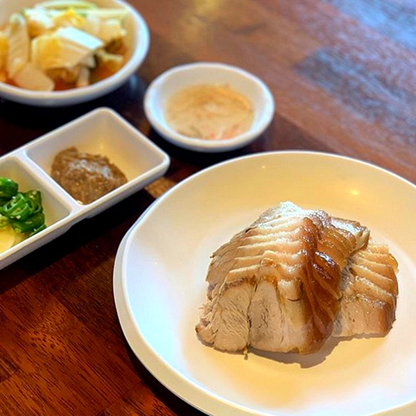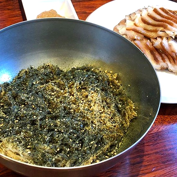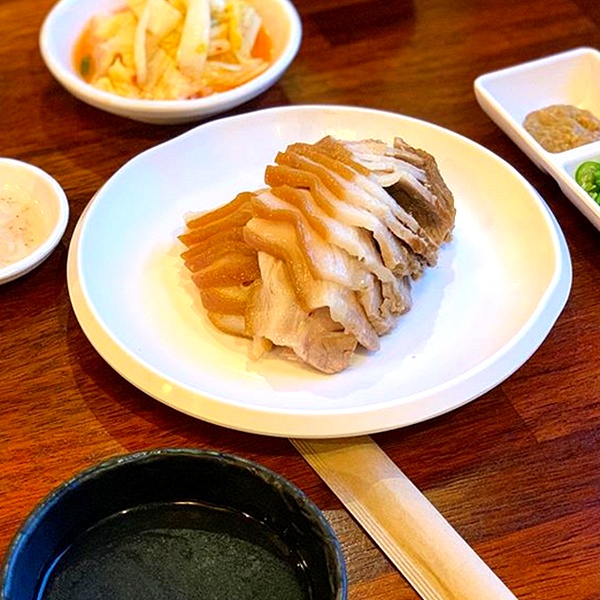 면수를 홀짝거린 지 얼마 지나지 않아 수육과 백김치가 나온다. 백김치를 먼저 맛본다. 시원하고 신선하다.