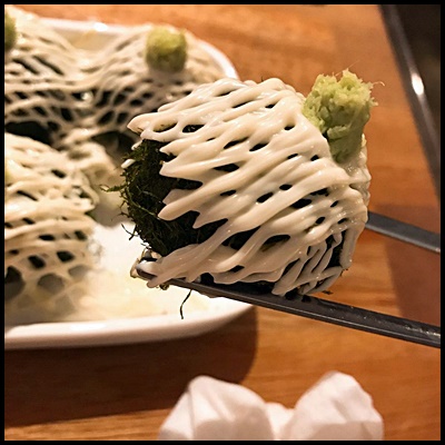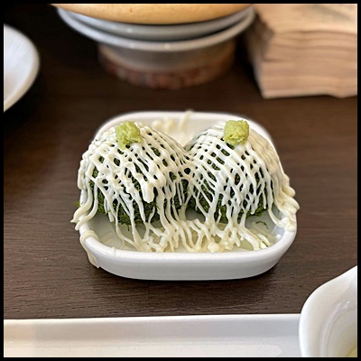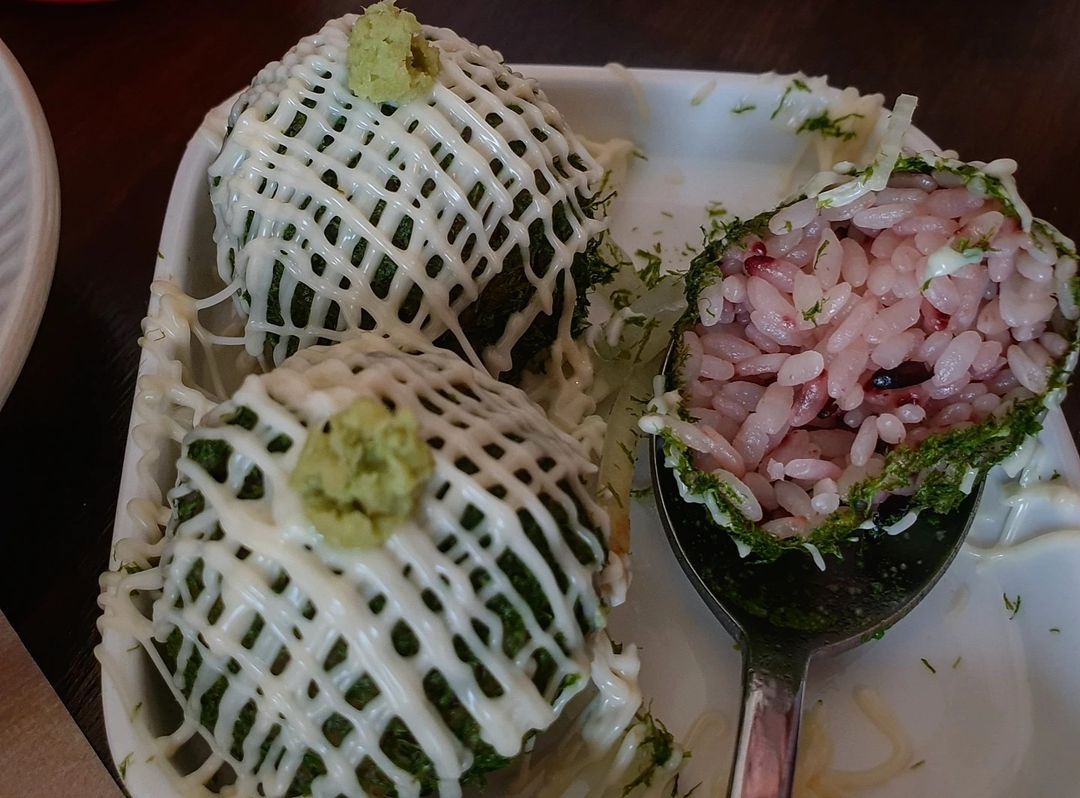 기본 주먹밥에 감태로 둘러싸여 있는데 보이는 것과 다르게 마요네즈와 순한 와사비가 엄청난 맛의 조화를 선사해준다고 하네요.