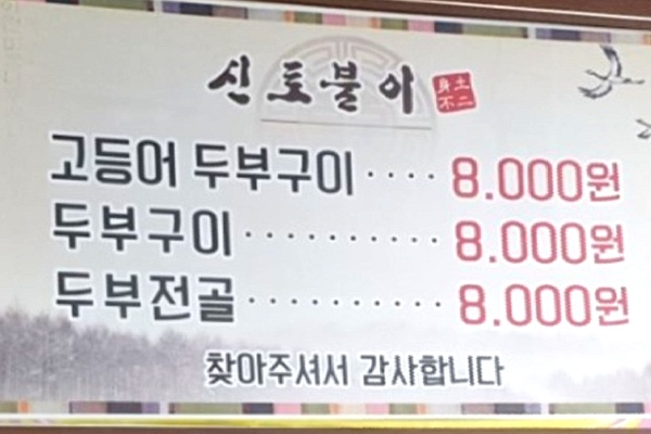 8,000원으로 고등어구이 두부구이 비지찌개 숭늉까지 나옵니다