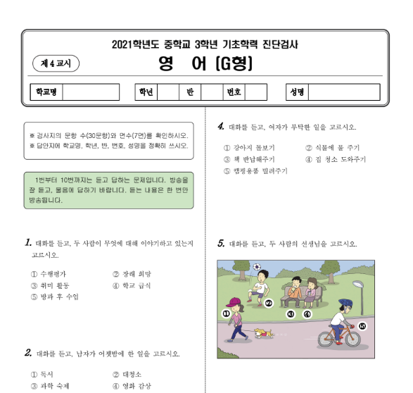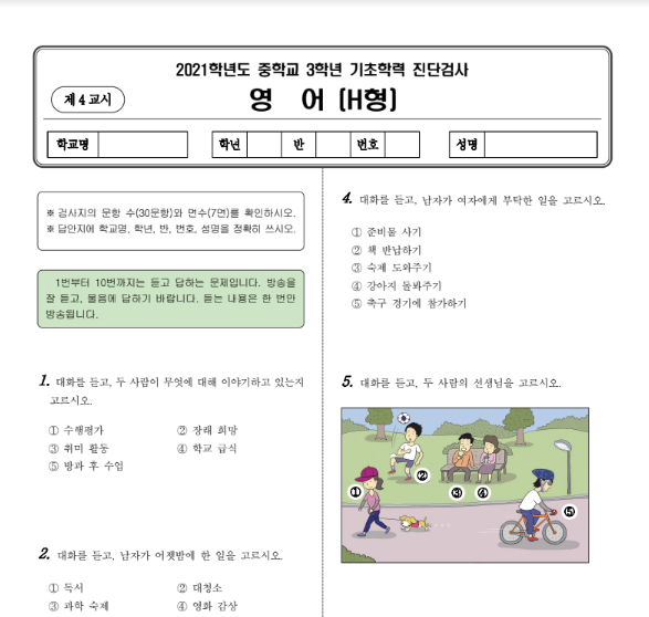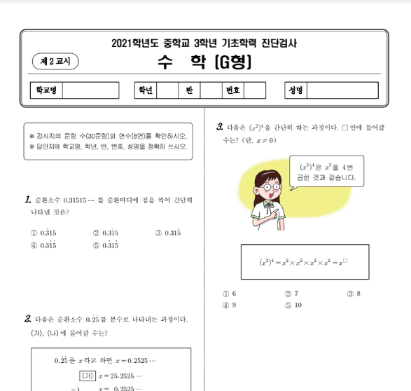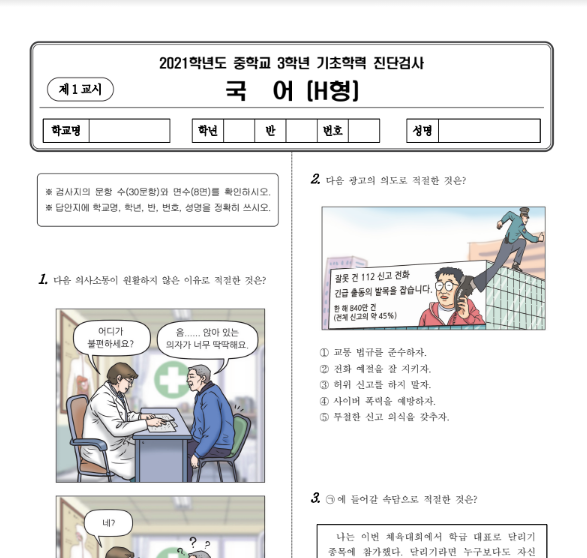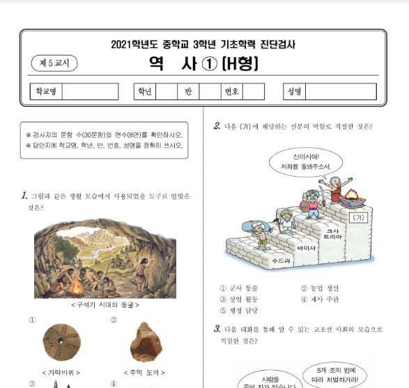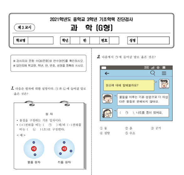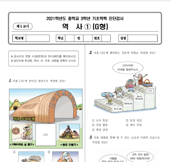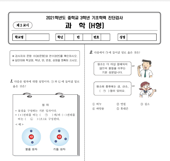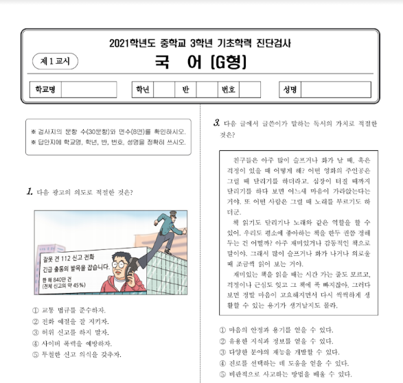 아래는 지난 2021년 3월부터 일부 학교에서 시행된 각 과목별 국어, 수학, 영어, 과학, 역사 중3 진단평가 문제의 앞부분입니다.