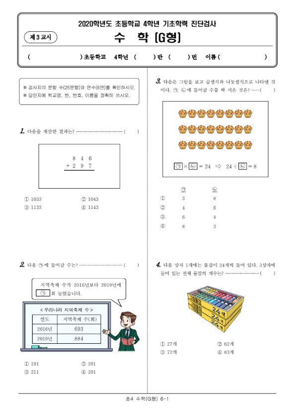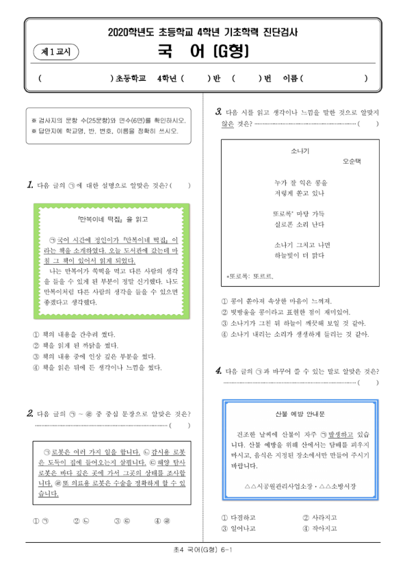 2020년 3월에 전국의 일부지역 초등학교에서 시행되었던 초등학교 4학년 기초학력 진단검사 초4 교과학습 진단평가 기출문제 포스팅입니다.
