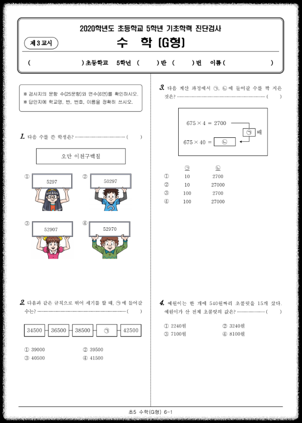 2020년 초5 진단평가 수학