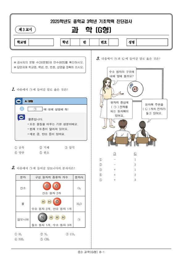 2025년 중3 진단평가 과학 캡쳐