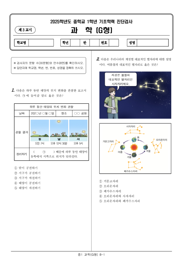 2025년 중1 진단평가 과학 캡쳐