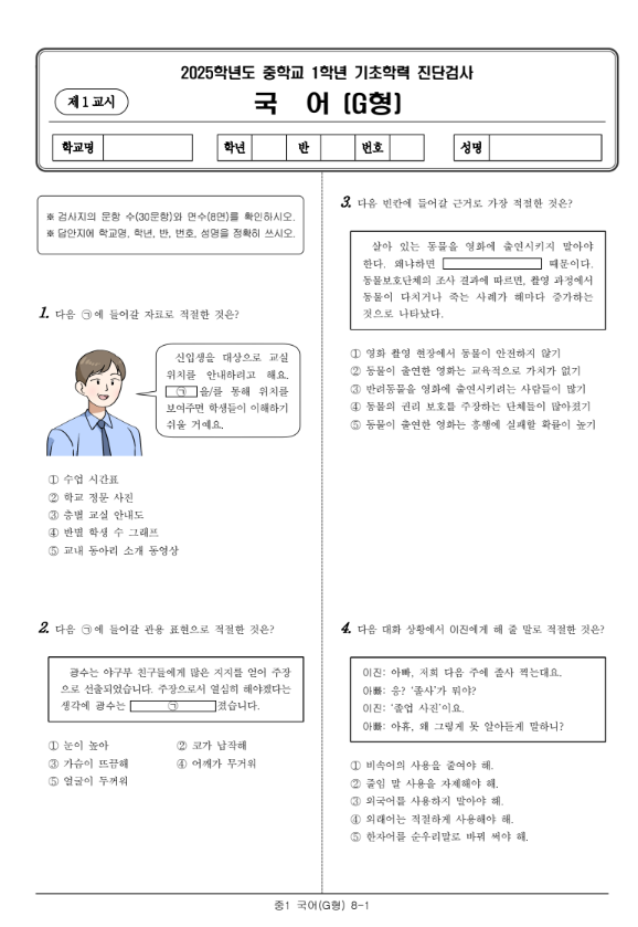 2025년 중1 진단평가 국어 캡쳐