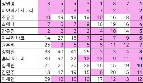 그리고 당시 아이즈원 데뷔조 프로듀스 48 1~8주간 순위 변동표도 공유중입니다.