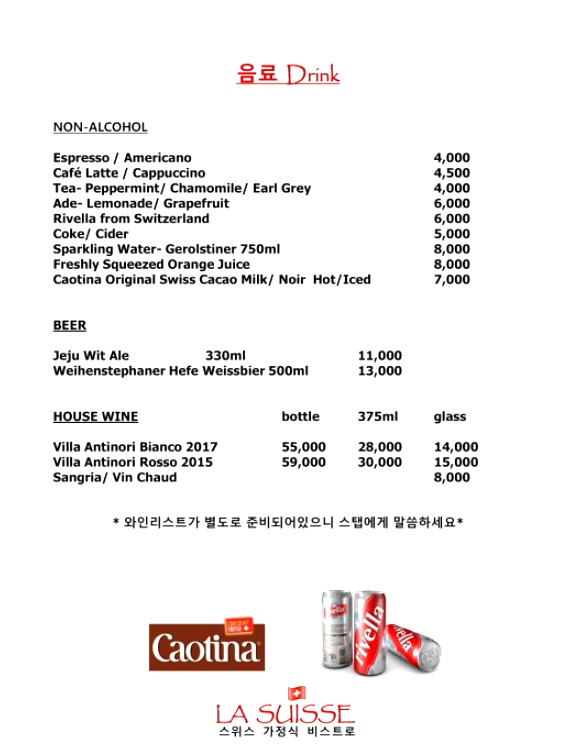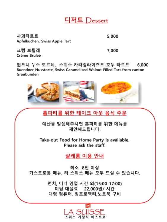 라스위스에서는 홈파티를 위한 테이크 아웃 음식도 주문이 가능하다고 하며, 샬레룸도 이용 가능한데 최소 8인 이상으로 가스트로통 메뉴와 라스위스 메뉴 모두 주문할 수 있다고 해요. 샬레룸에는 대형컴퓨터와 빔프로젝터, 노트북등도 구비되어 있다고 합니다.