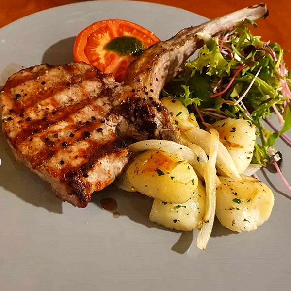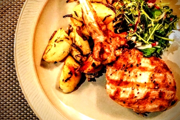 Schweinekotelette, Charcoal Grilled Fork Chop with Roasted Potatoes