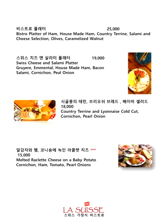 - 국산돼지로 직접 만든 수제햄을 얹은 뢰스티위에 스위스 발레(Valais)지역의 유명한 치즈 라클렛치즈를 녹여 부어드립니다.