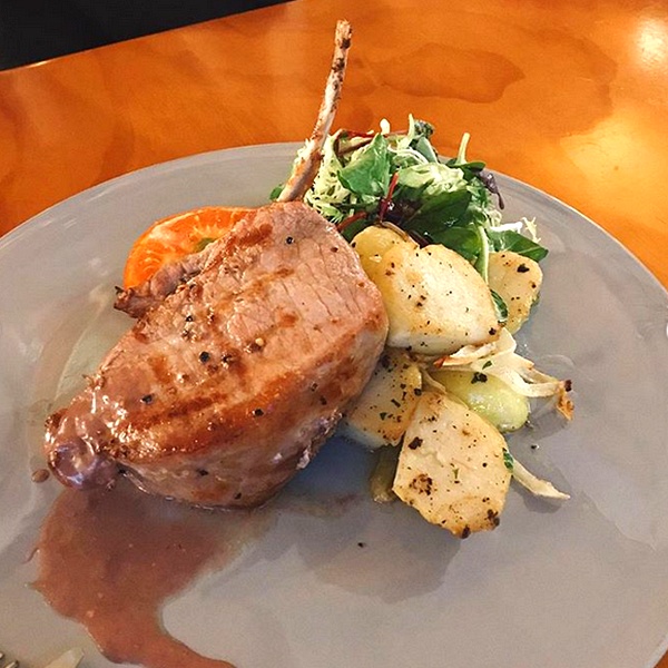 Charcoal Grilled Pork Chop with Sauteed Potatoes and Oven Baked Tomato