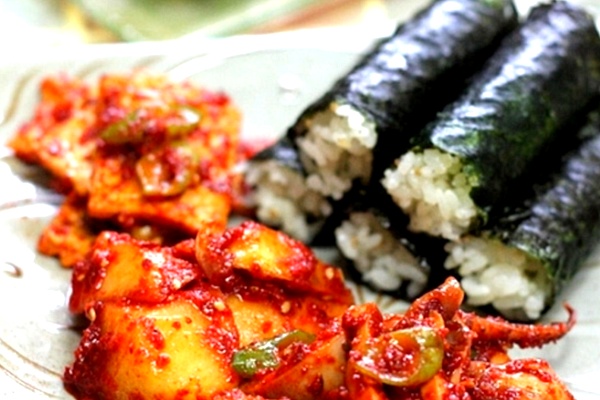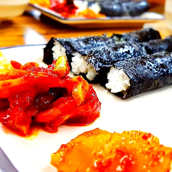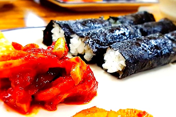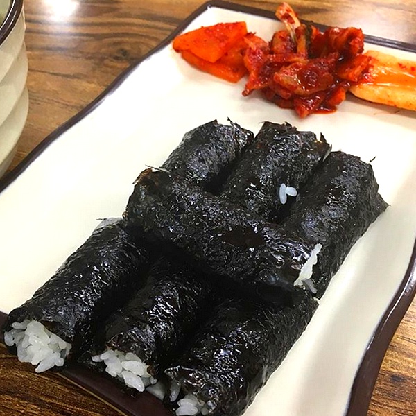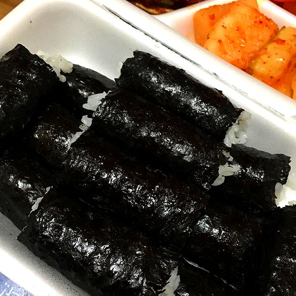 손가락 굵기의 아무 속 없는 김밥과 깍두기, 오징어 어묵 무침이라는 매우 간단한 구성을 자랑한다.